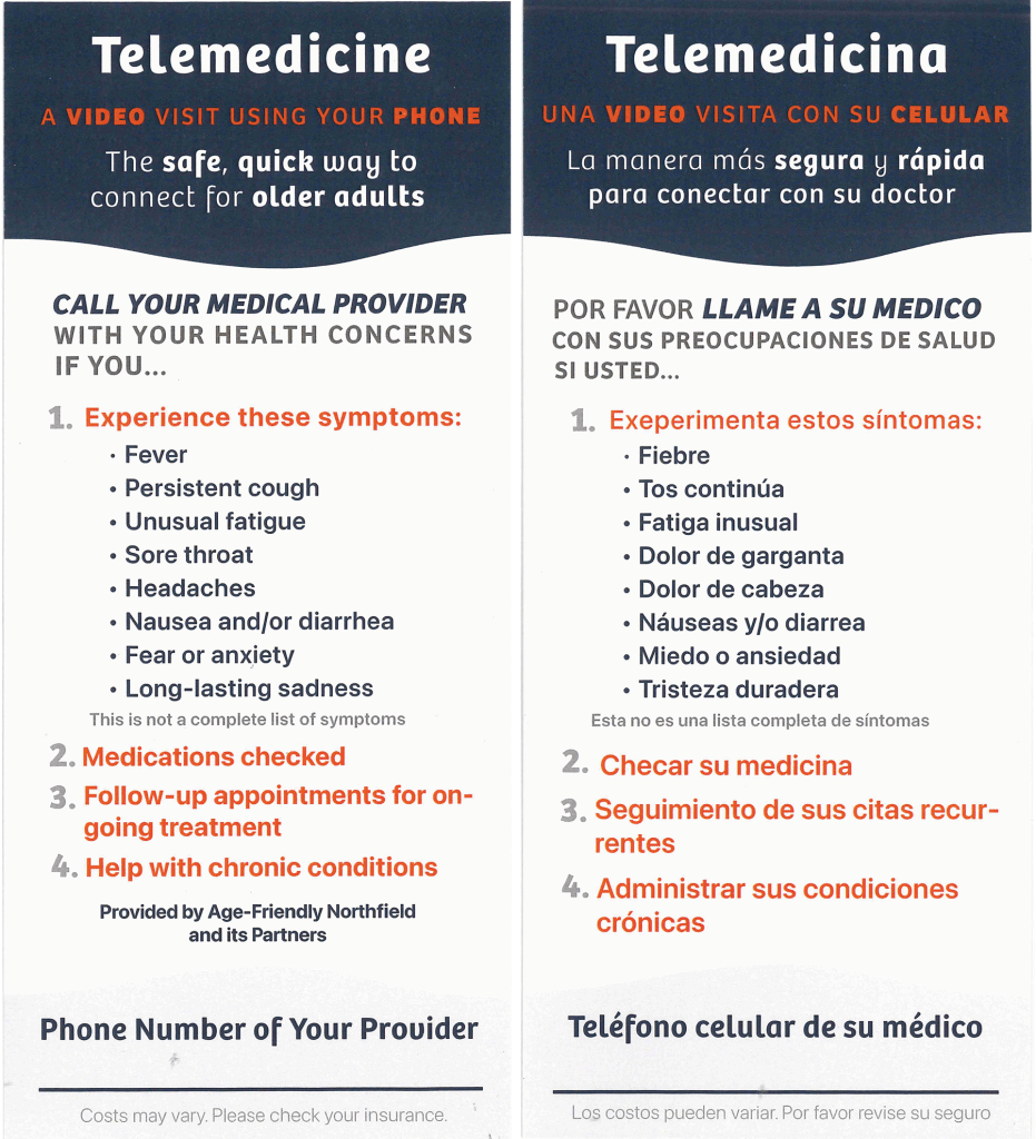 Telemedicine is here to stay! COVID-19 stresses the value of telemedicine. Over the past eighteen months, we were restricted in our physical access to our health care providers. Telemedicine appeared as an answer. However, the Age-Friendly Northfield Health & Wellness team realized that many older adults weren’t aware or comfortable with all that telemedicine could accomplish.The efficiency and ease of telemedicine could help so many of us connect with our providers from the safety of our homes. With funding from Northfield Hospital & Clinics, AFN developed a handy guide in both English and Spanish to familiarize us with the wide range of services available over the phone or computer, especially helpful to those living in rural areas or having transportation barriers. In 2020, one-third of patient visits were telemedicine. Over 83% of providers surveyed by the MN Hospital Association reported that telemedicine was meeting patient needs! All providers are ready to handle your call.These guides are distributed around town as well as FiftyNorth (senior center). You are welcome to pick one up. Pass some around to your friends.